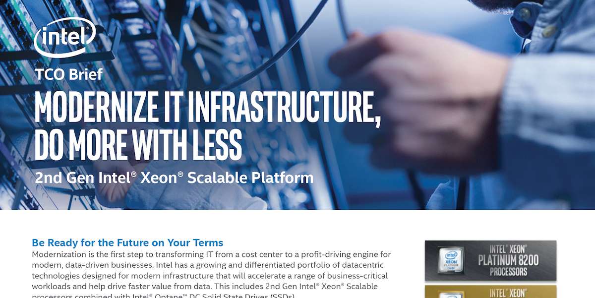 This Intel® TCO brief, “Modernize IT Infrastructure, Do More with Less,” explores the business value of IT modernization and Intel’s new data center technologies. It focuses on the key benefits of upgrading data center infrastructure, including reducing technical debt, improving data security, supporting expanding workloads, and easing the path to hybrid cloud. Intel® 2nd generation Xeon® processor 4X performance enhancements are featured in the brief.