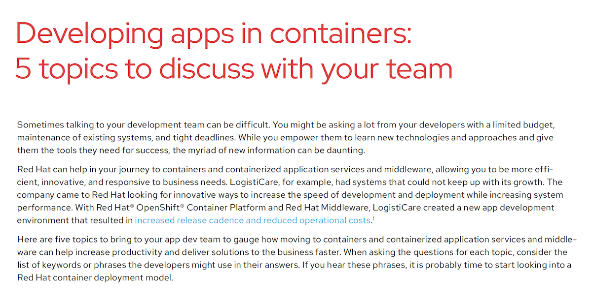 This solution brief offers ideas for topics of discussion when journeying to containers and containerized application services and middleware. Check out these five topic ideas from Red Hat for a better idea on how moving to containers and containerized app services and middleware drives productivity and solution delivery!