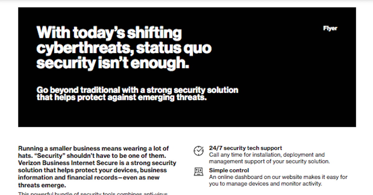 This flyer explains how Verizon Business Internet Secure helps protect businesses’ devices, business information, and financial records—even as new threats emerge. Business Internet Secure features strong protection, proactive threat detection, 24/7 security tech support, and simple control. Please contact Enterprise Technology International for more information about Verizon Business Internet Secure.