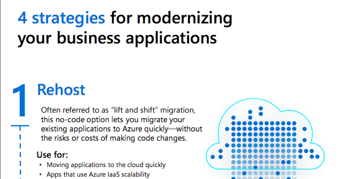 This infographic outlines the 4 different strategies available to migrate your apps to Microsoft: rehost, refactor, rearchitect, or rebuild.