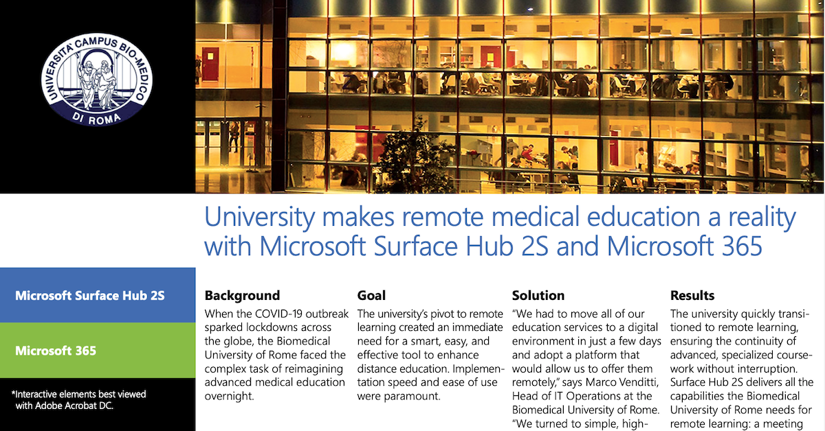 This interactive ActivGraphic™ shows that the Biomedical University of Rome combined Microsoft solutions with Surface Hub 2S to respond to the COVID e-learning urgency. For more information about combining Microsoft solutions with Surface Hub 2S for e-learning, please contact Enterprise Technology International.