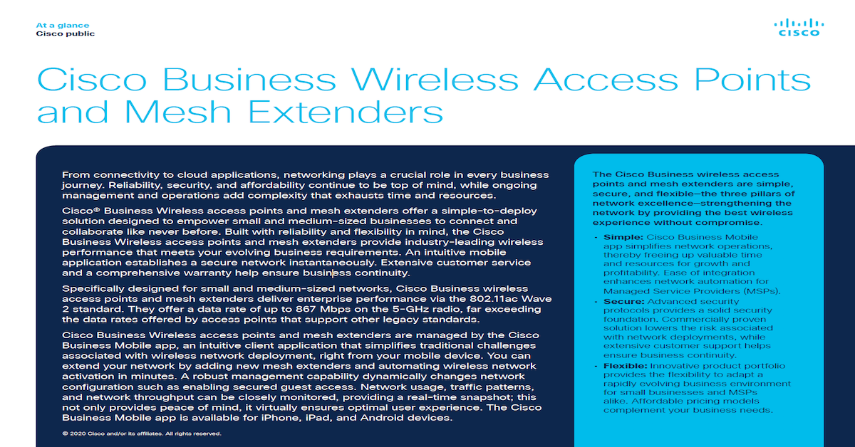 This at-a-glance overview describes how Cisco Business Wireless access points and mesh extenders offer small to medium-size networks business continuity. Please contact Enterprise Technology International for more information about Cisco Business Wireless access points and mesh extenders.