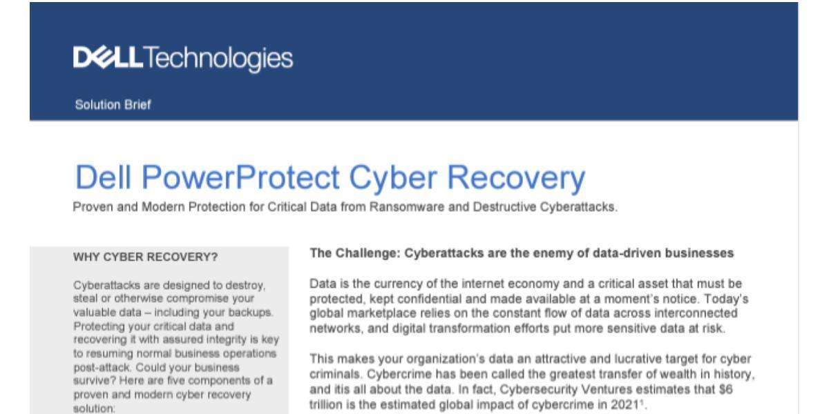 Cyberattacks are designed to destroy, steal and otherwise compromise valuable data including backups. Read this solution brief for five components of a proven and modern cyber recovery solution: