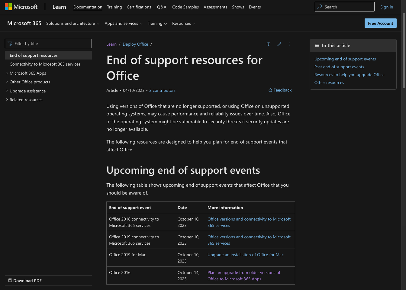 This website provides a list of key resources for Office 2013 and other versions that will also be reaching the end of support in 2023 and 2024.