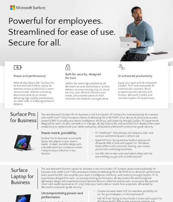Your team needs tools that are tailored for today’s challenges. The latest @Microsoft Surface Pro for Business is the first Surface Copilot+ PC specifically crafted for enterprises. 💡 This versatile 2-in-1 device offers on-device AI capabilities, lasts all day on a single charge, and features Microsoft’s robust chip-to-cloud security. It’s built to support dynamic teams and maximize their use of Microsoft 365 Copilot. Check out the flyer for more information.