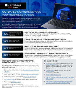 Read MoreRelying on aging laptops puts your business at risk, especially with Windows 10 support ending soon. β³ Don’t let old hardware and Windows 10 EOS put your business at risk. Download the brief to see why Dynabook with #Windows11Pro is the smarter choice. @Dynabook Americas #SmallBusinessTech
